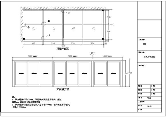 某企业内部的阳光房设计施工图纸,图纸设计细致,包括立面展开图、顶棚平面图、多出节点图等,供相关人士下载参考。