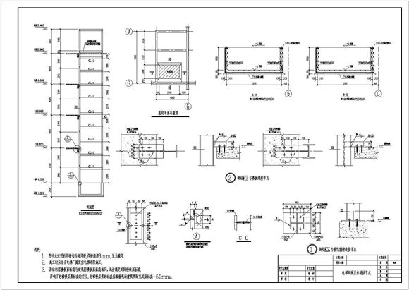 全套电梯井施工图主要包括:电梯剖面及柱拼接节点、电梯平面布置图及节点详图、屋顶楼板洞口布置图、檩条布置图、楼板洞口次梁布置图、楼板洞口配筋布置图等共6张图纸。绘制于2011年。