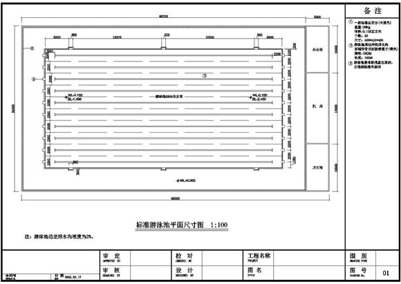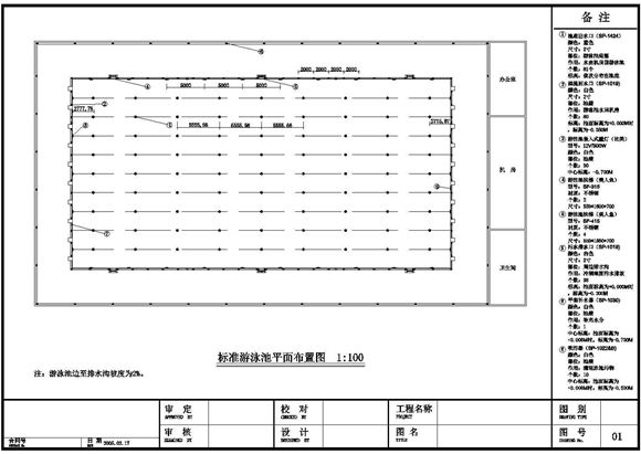 泳池容积:V=2200M,循环周期T=6H循环水量Q=367M/H,泳池初次充水量:Q=400M/h图纸内容包括:标准游泳池平面布置图,标准游泳池平面尺寸图,标准游泳池平面布置图,