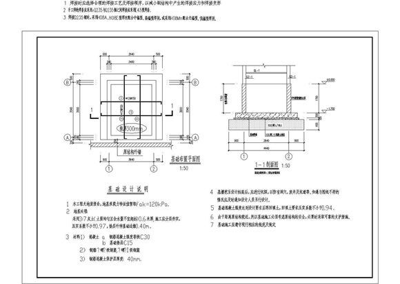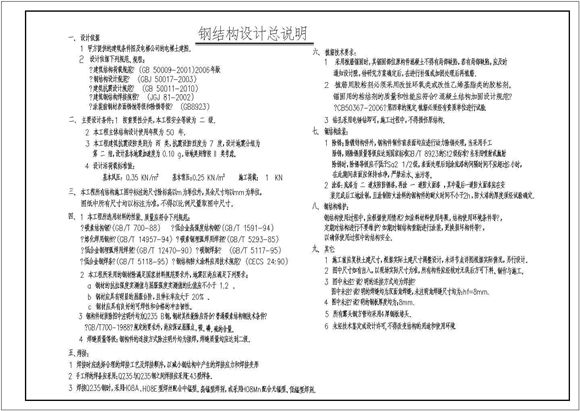 包含钢结构设计总说明、基础设计说明、剖面图、预埋件布置平面图、钢柱布置平面图、结构布置平面图、屋面结构布置平面图、钢架布置立面图共7张图纸。基础布置平面图结构布置平面图连接大样角部钢柱与