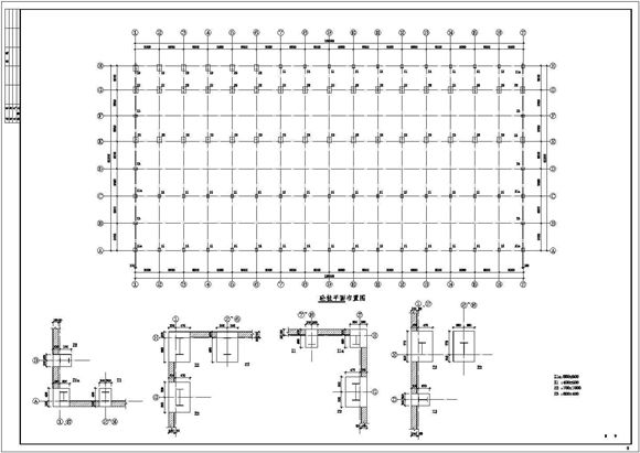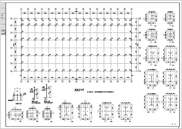 某门式刚架结构设计图本次设计为:某门式刚架结构设计图图纸包括:预埋定位图、柱网布置图、吊车梁平面布置图、水平支撑布置图、柱间支撑布置图、檩条布置图、墙梁布置图、剖面图、节点详图、夹层