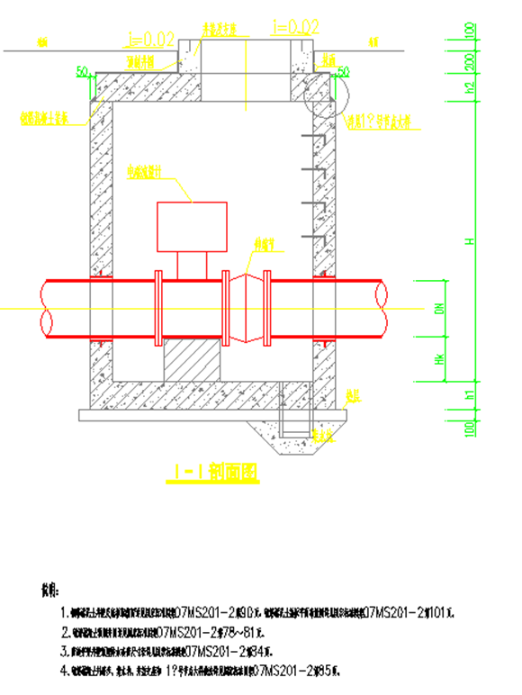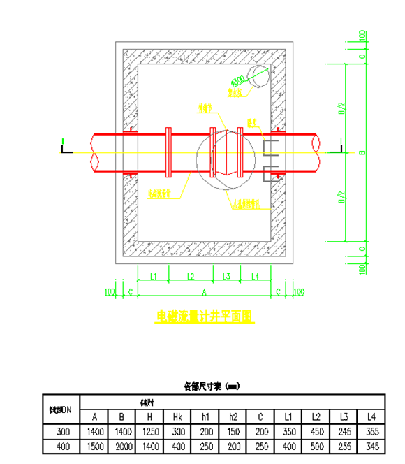 本图适用于DN300/DN400电磁流量计安装,含橡胶伸缩接头。图纸包括:电磁流量计井平面图、剖面图、各部尺寸表,可供参考。