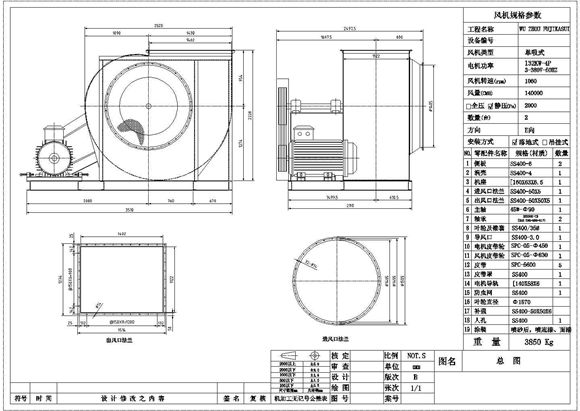 本图纸为某大型通风风机标准cad设计施工图例(标注详细);包括:出风口法兰图、进风口法兰图、风机正视图、风机侧视图、风机规格参数表等;设计规范,可供参考学习。