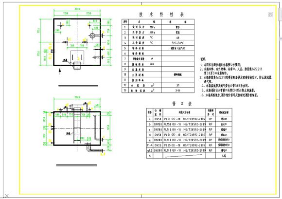 高位消防水箱管口方位图,包括平面图、里面图。达到施工图深度。