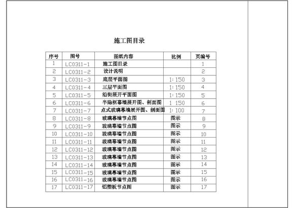 玻璃幕墙施工图纸。图纸包括:设计说明、底层平面图、三层平面图、沿街展开平面图、幕墙展开图及剖面图、玻璃幕墙节点图、铝塑板节点图共16张图纸。