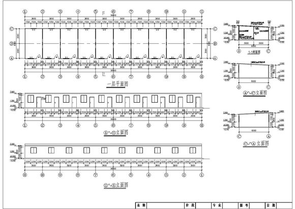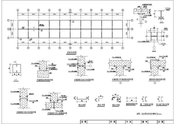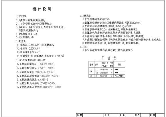 某活动板房施工图本次设计为:某活动板房施工图基本风压:0.35KN/㎡基本雪压:0.25KN/㎡图纸包括:设计说明、一层平面图、立面图、屋顶平面图、基础地梁平面图、屋面结