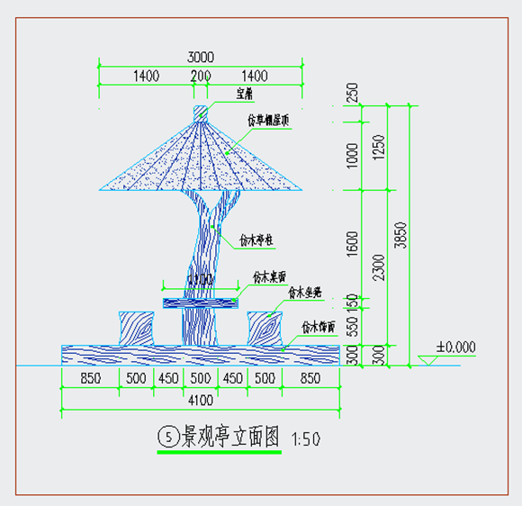 4.5米拱形钢筋混凝土小桥。直径3M伞形小凉亭带坐凳,混凝土拟木造面。图纸包括:平面图、立面图、剖面图、结构图等,可供设计师参考。