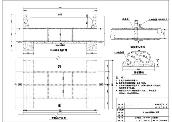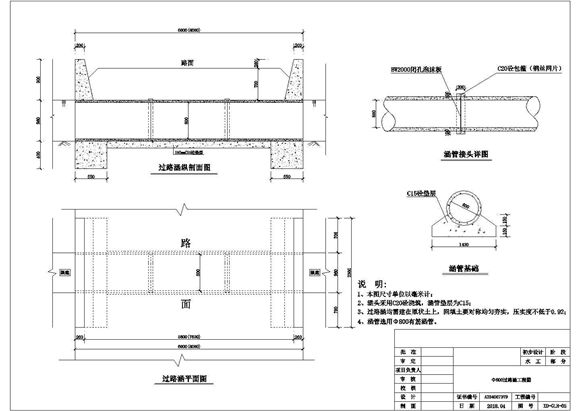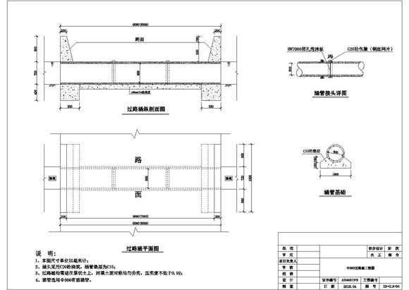 水利工程过路涵5种规格图涵管直径,300mm、400mm、600mm、800mm和1000mm,图纸包括:过路涵平面图、过路涵纵剖面图、涵管接头详图、涵管基础图,可供参考。