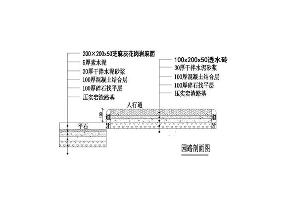 透水砖人行道、园路施工做法图,图纸内容包括:路面详图,园路剖面图,园路施工做法等。