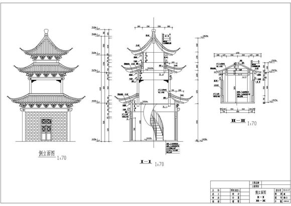 亭子详细CAD图纸完整版,其中包括亭子正立面图、亭子剖面图,亭子共三层