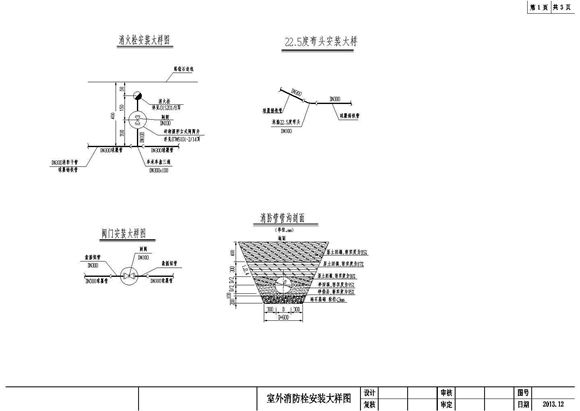 设计说明:无,建筑功能:其他资料目录消火栓安装大样图22.5度弯头安装大样阀门安装大样图消防管管沟剖面排泥阀安装大样图预留管连接大样图地上式消防栓安装立面图地上式消防栓安装平面图闸