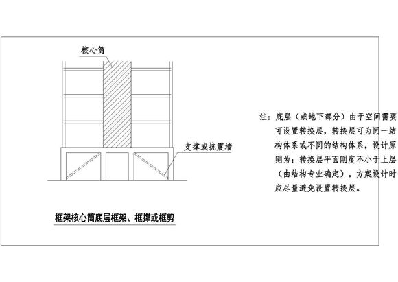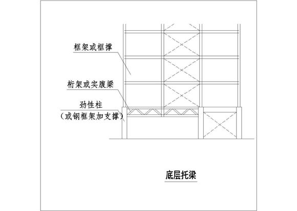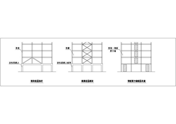 框架底层抽柱、框撑底层框架、钢板剪力墙错层布置、底层托梁、框架核心筒底层框架、框撑或框剪共1张图纸。