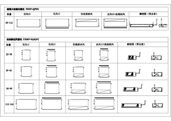 本资料为:经典多联机空调系统设计cad图块图例集合(标注详细,种类齐全);内含:RVX系列室外机图块、超薄小巧风管式FXDP-QPVC图例、环绕气流嵌入式FXFP-LVC型图块、挂壁式FX