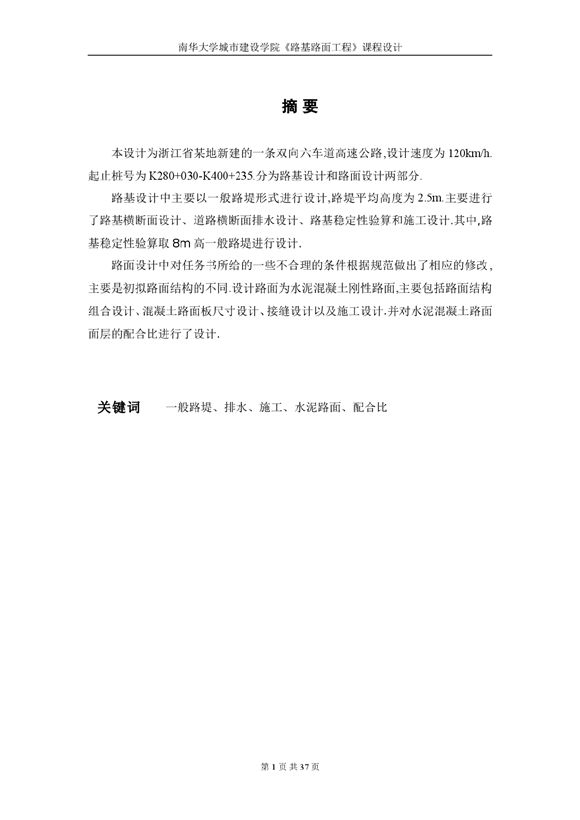 本设计为浙江省某地新建的一条双向六车道高速公路,设计速度为120km/h.起止桩号为K280+030-K400+235.分为路基设计和路面设计两部分.路基设计中主要以一般路堤形式进行设计,路堤平均高度