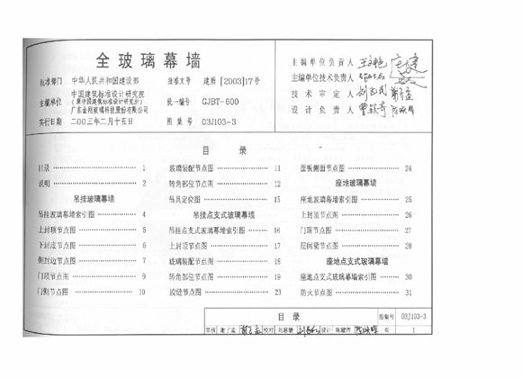 本文为03J103-3全玻璃幕墙图集,主要包括吊挂玻璃幕墙、吊挂点支式玻璃幕墙、座地玻璃幕墙、座地点支式玻璃幕墙四个大类。
