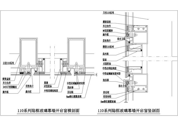 本图纸为隐框玻璃幕墙开启窗节点详图,图纸包含着110系列隐框玻璃幕墙开启窗横剖面,110系列隐框玻璃幕墙开启窗竖剖面,图纸内容完整,表达清晰,制图严谨,欢迎设计师下载使用。
