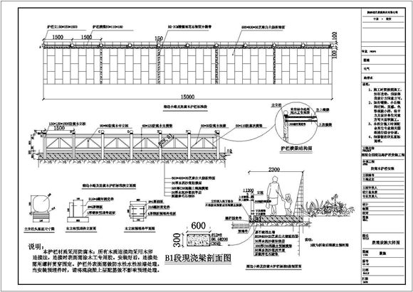 防腐木栏杆详图,内含详细标注,带有护栏横梁结构图,现浇梁剖面图,主立柱预埋件平面图,主立柱头里面尺寸图等等,可供参考。