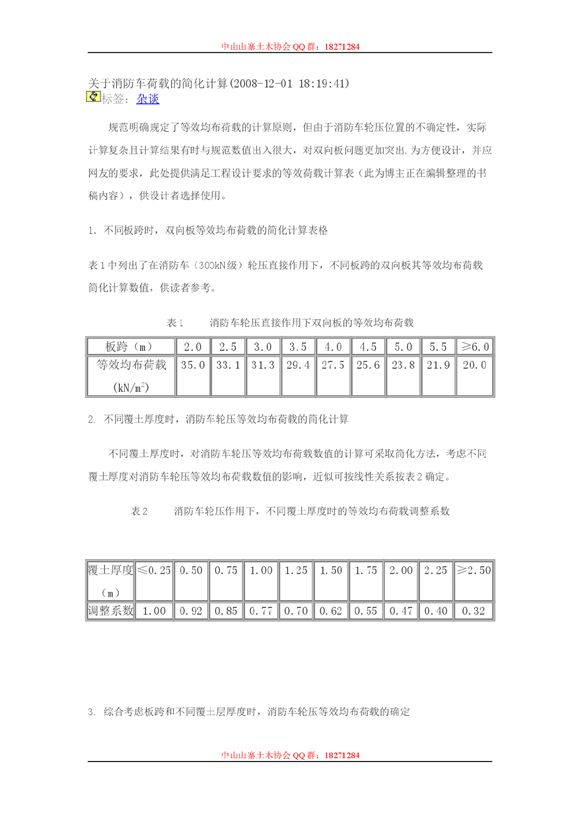 规范明确规定了等效均布荷载的计算原则,但由于消防车轮压位置的不确定性,实际计算复杂且计算结果有时与规范数值出入很大,对双向板问题更加突出.为方便设计,并应网友的要求,此处提供满足工程设计要求的等效荷载