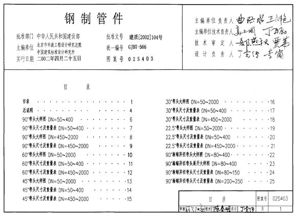 02S403钢制管件图集。本图集系根据建设部202号文件并在1975年编制的S311《钢制管道零件》图集基础上修编完成的。