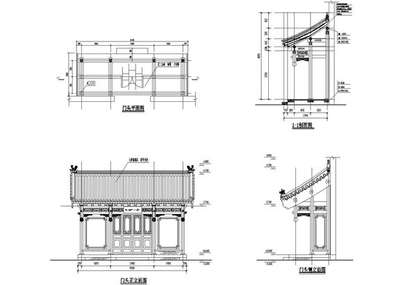 本图纸为某仿古中式门头建筑设计cad全套施工图(标注详细);包括:平面图、正立面图、侧立面图、1-1剖面图等;设计规范,可供参考学习。