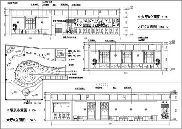 本图纸为:江苏省南京市某优雅型咖啡厅设计CAD图纸,内容包括:包间C立面图,大厅D立面图,吊顶布置图等,设计全面,可供设计师参考。