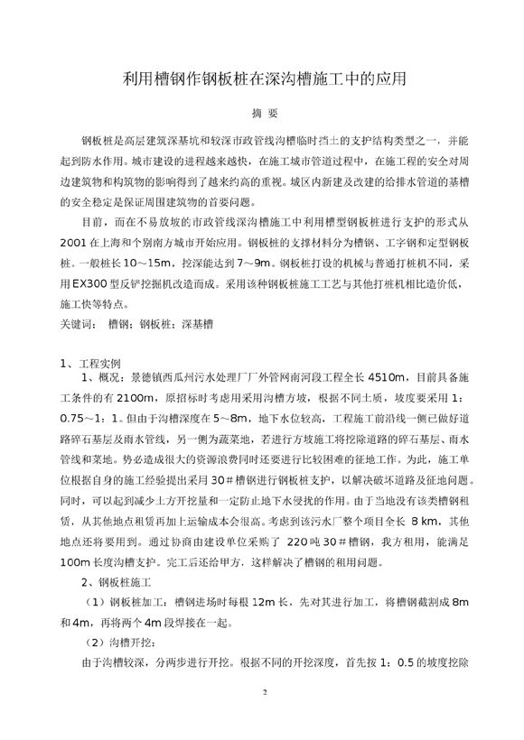 在不易放坡的市政管线深沟槽施工中利用槽型钢板桩进行支护的形式从2001在上海和个别南方城市开始应用。钢板桩的支撑材料分为槽钢、工字钢和定型钢板桩。一般桩长10~15m,挖深能达到7~9m。钢板桩打设的