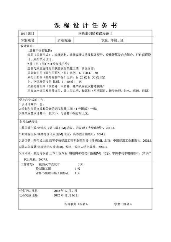 三角形钢屋架在工业厂房中得到广泛应用,三角形钢屋架的设计包括材料的选择,钢屋架的几何尺寸,屋架及屋盖的支撑布置,檩条的设计节点的设计和施工图的绘制。对于檩条,杆件和节点的设计要仔细验算各自的受力大小