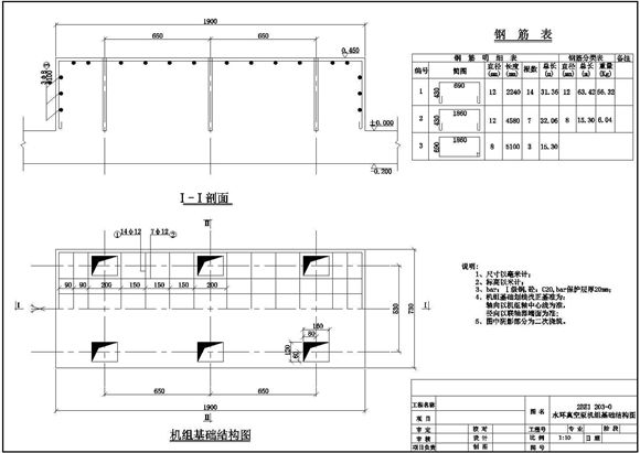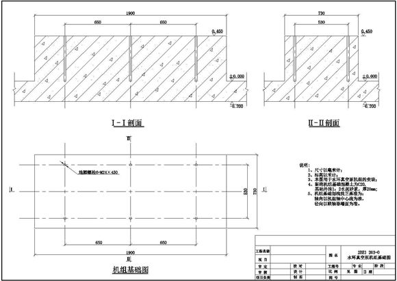 某地水环真空泵机组基础安装设计图,图纸内容包括:水环真空泵机组基础图、水环真空泵机组安装设计图、水环真空泵机组基础结构图。