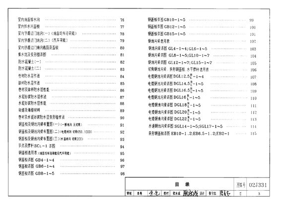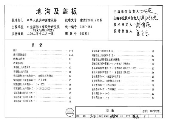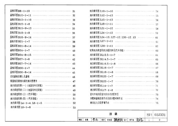 02J331图集包括地沟及盖板说明、砖地沟选用表、砖地沟详图、素混凝土地沟详图、钢筋混凝土及素混凝土地沟材料表、盖板选用表、盖板详图、活动盖板及钢人孔盖板等内容。