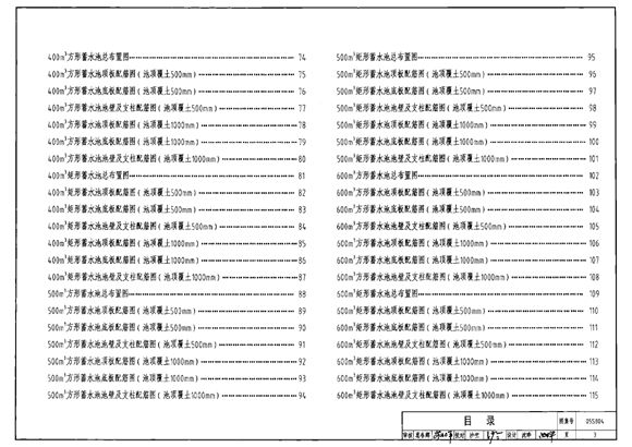 本图集包括矩形钢筋混凝土+蓄水池及其附属配件做法。其规格为总容积50~2000m,其池顶覆土厚度分为500mm和1000mm二种。本图集按现行结构设计规范对原国标图《矩形钢筋混凝土清水池》96S82