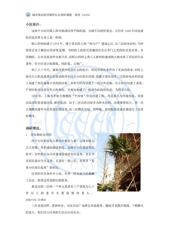 这篇论文为同济大学建筑与城市规划学院本科生城市规划原理课程作业。作者试图从一个已经改造好与一个正在进行改造的小区的对比中找到旧房改造的症结,寻求和谐改造的途径。