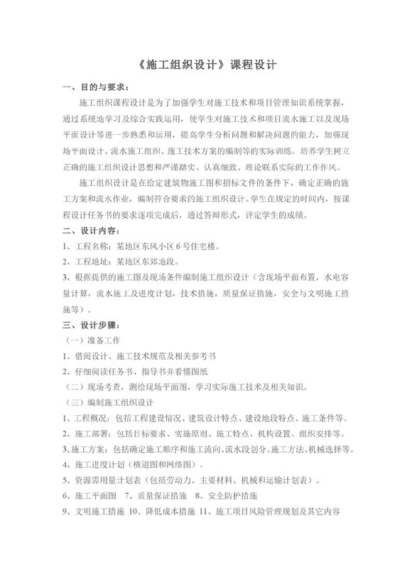 施工组织课程设计是为了加强学生对施工技术和项目管理知识系统掌握,通过系统地学习及综合实践运用,使学生对施工技术和项目流水施工以及现场平面设计等进一步熟悉和运用,提高学生分析问题和解决问题的能力,加强现