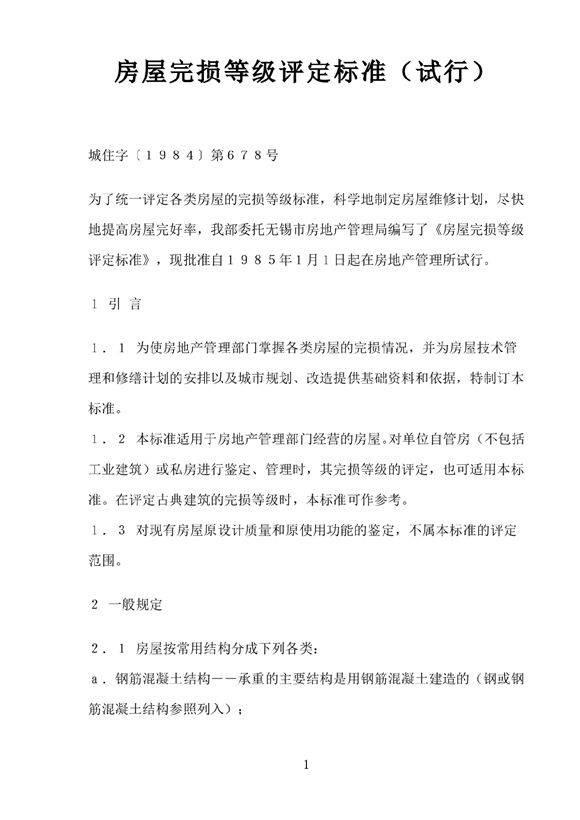 城住字〔1984〕第678号为了统一评定各类房屋的完损等级标准,科学地制定房屋维修计划,尽快地提高房屋完好率,我部委托无锡市房地产管理局编写了《房屋完损等级评定标准》,现批准自1985年1月1日起在