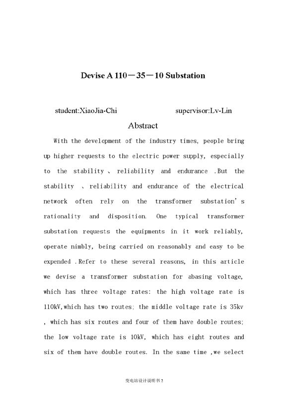 本论文设计了一个降压变电站,此变电站有三个电压等级:高压侧电压为110kv,有二回线路;中压侧电压为35kv,有六回出线;其中有四回出线是双回路供电。低压侧电压为10kv,有八回出线,其中有六回是双回