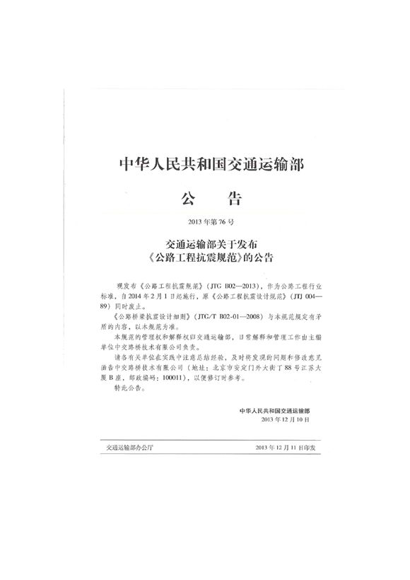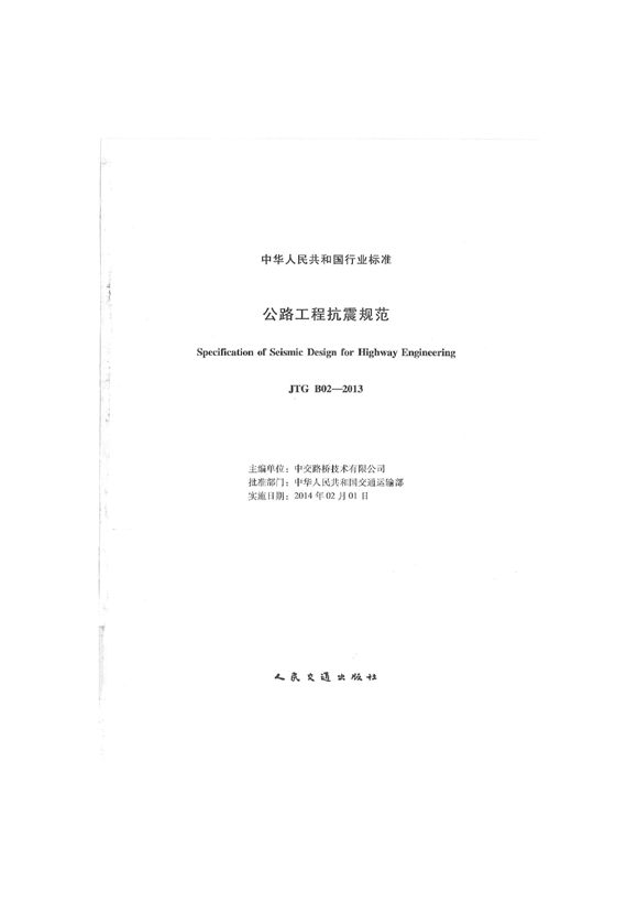 本规范适用于各等级公路的工程构筑物抗震设计,包含基本规定、地基基础知识桥梁、隧道、挡土墙、路基、涵洞等的挡震强度及稳定性的验算。
