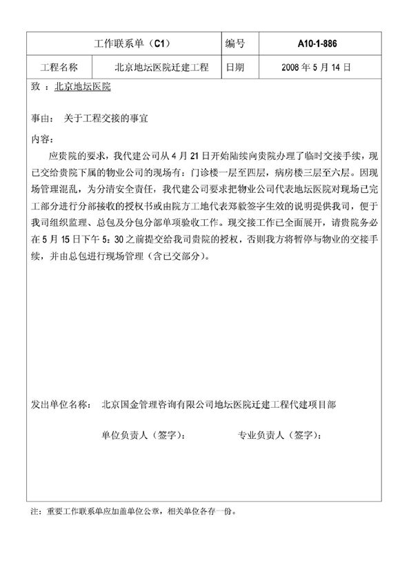 应贵院的要求,我代建公司从4月21日开始陆续向贵院办理了临时交接手续,现已交给贵院下属的物业公司的现场有:门诊楼一层至四层,病房楼三层至六层。因现场管理混乱,为分清安全责任,我代建公司