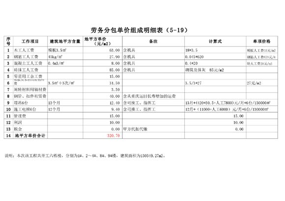 劳务分包单价明细表,包括:木工、钢筋工、混凝土工、砖抹工、零星用工等人工费及设备租赁费用,含地平方单价、计算式、单项价格,可供参考。