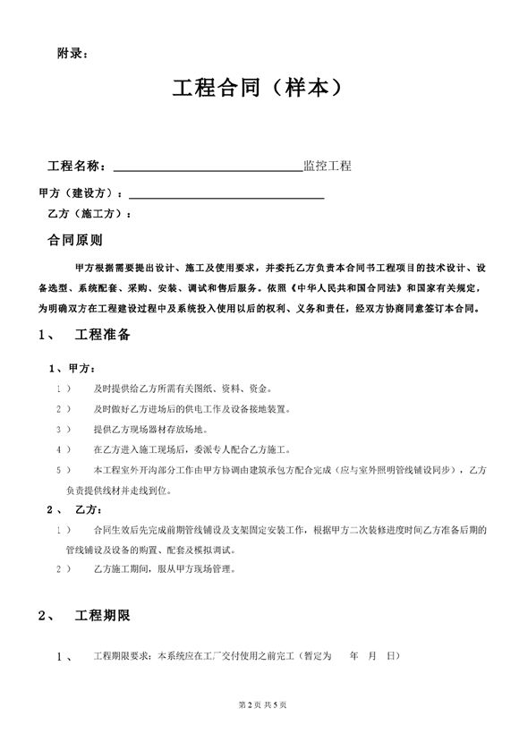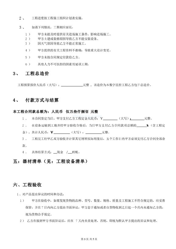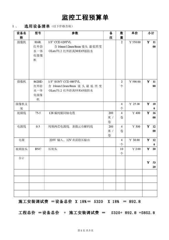 某监控工程设备预算清单(包含设备名称、型号、参数、数量以及价格),内附合同样本,仅供参考。