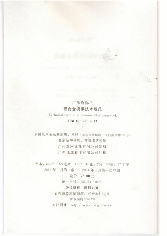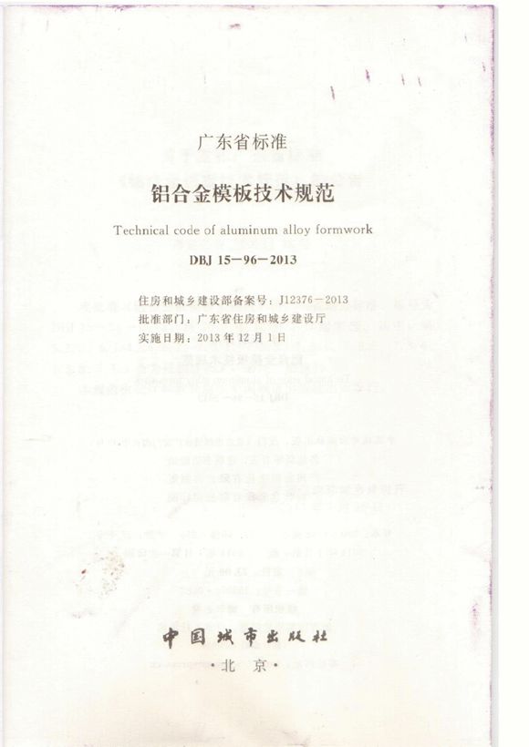 最新技术规范《铝合金模板技术规范》DBJ15-96-2013