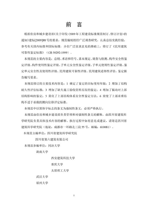 1.0.1为正确鉴定民用建筑的可靠性,加强对民用建筑的安全与合理使用的技术管理,制定本标准。1.0.2本标准适用于以混凝土结构、钢结构、砌体结构、木结构为承重结构的民用建筑及其附属构筑物的可靠性