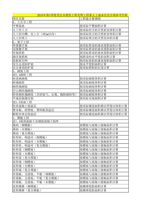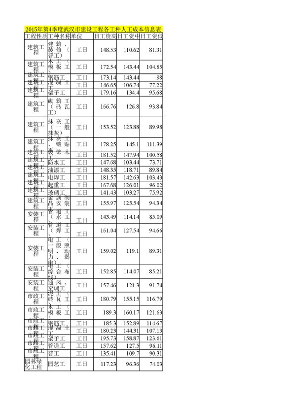 武汉市建筑工程实物工程量人工成本信息市场参考价格及各工种人工成本信息表