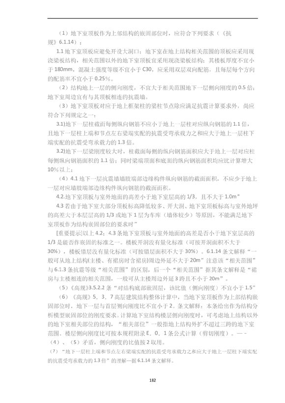 地下室顶板应避免开设大洞口;地下室在地上结构相关范围的顶板应采用现浇梁板结构,相关范围以外的地下室顶板宜采用现浇梁板结构;其楼板厚度不宜小于180mm,混凝土强度等级不宜小于C30,应采用双层双向配筋
