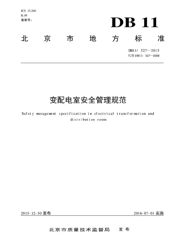 本文档为:DB11-527-2015-变配电室安全管理规范。内容包括:范围、规范性引用文件、一般要求、设备设施等。内容详实,可供参考。