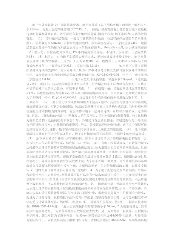 地下室外墙设计为了满足抗渗要求,地下室外墙(以下简称外墙)的厚度一般不应小于250mm,混凝土强度等级常用C20~C30