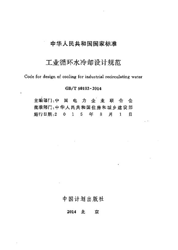 本资料为:GBT50102-2014工业循环水冷却设计规范,很实用,欢迎下载参考。