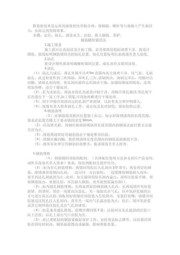 植筋新技术是运用高强度的化学粘合剂,使钢筋、螺杆等与混凝土产生握固力,从而达到预留效果。