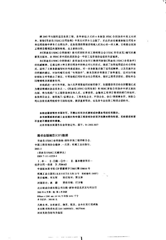 菲迪克(FIDIC)合同指南应用FIDIC1999年第1版合同条件的详细指南。施工合同条件(新红皮书CONS)生产设备和设计-施工合同条件(新黄皮书P&DB)设计采购施工(EPC)/交钥匙工