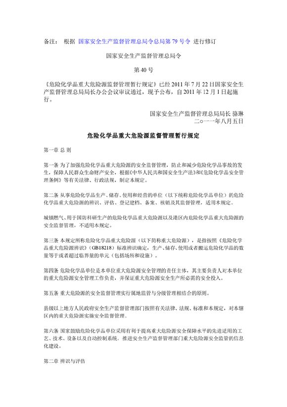 危险化学品重大危险源监督管理暂行规定【2015年修订】40号