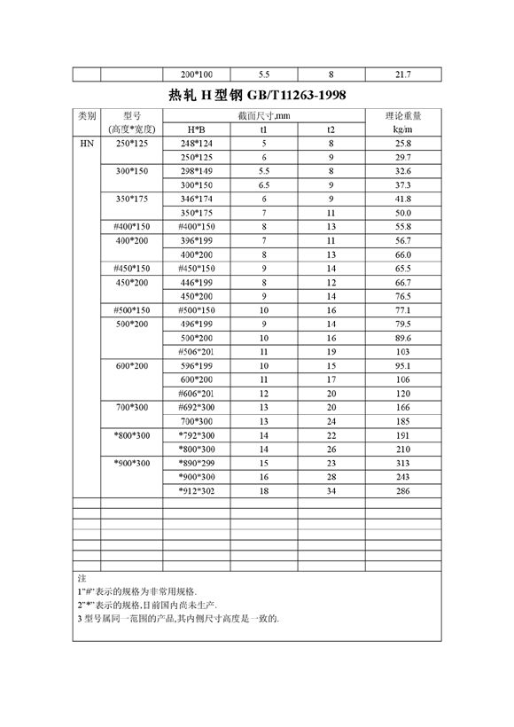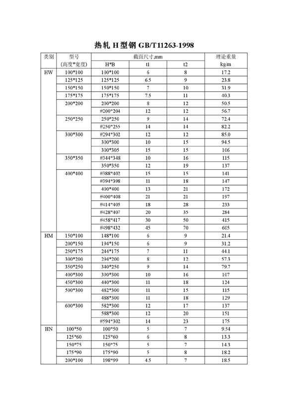 各种常见的热轧H型钢规格,包括HN,HM,HW各种型号.