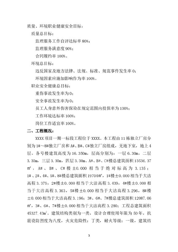 本工程由11栋独立厂房分别为1#~8#独立厂房和A#、B#、C#独立厂房组成,无地下室,地上4层。各号楼建筑高度为16.350m,层高分别为:一层6.30m,二层3.30m,三层3.30m,四层3.3